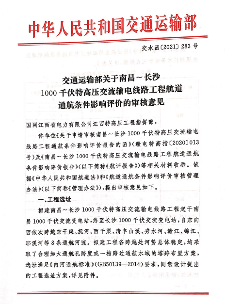 2021年7月,南昌~长沙1000千伏特高压交流输电线路工程项目取得交通运输部航道通航影响评价通过的正式批文。